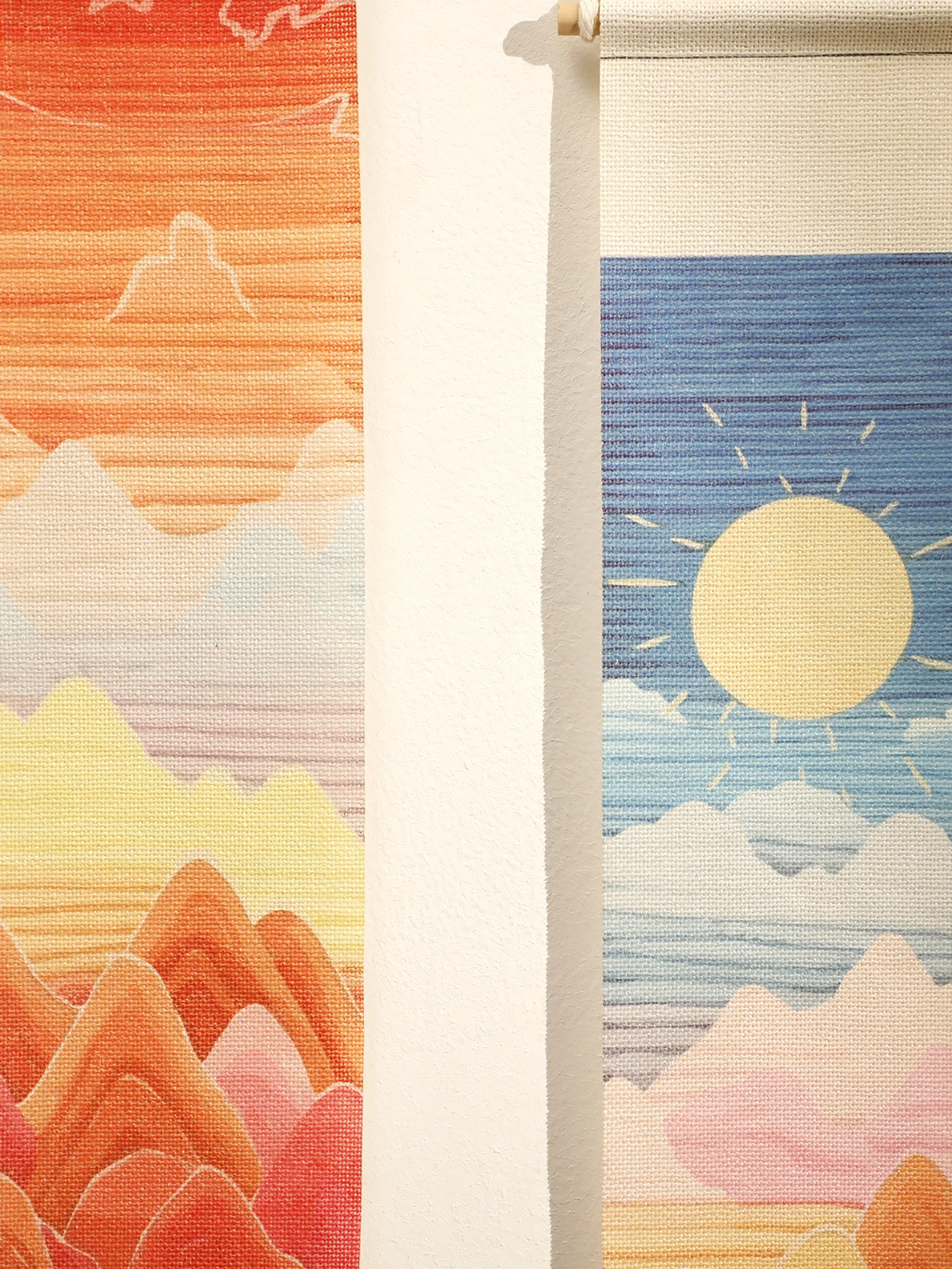 Infunda um toque de charme boêmio em seu espaço com esta tapeçaria de parede Macrame, com uma serena cena de montanha e nascer/pôr do sol.